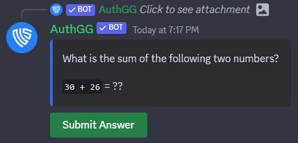 Allow new users to solve a basic math question right on Discord and only grand access if they pass the verification by answering the math question correctly.